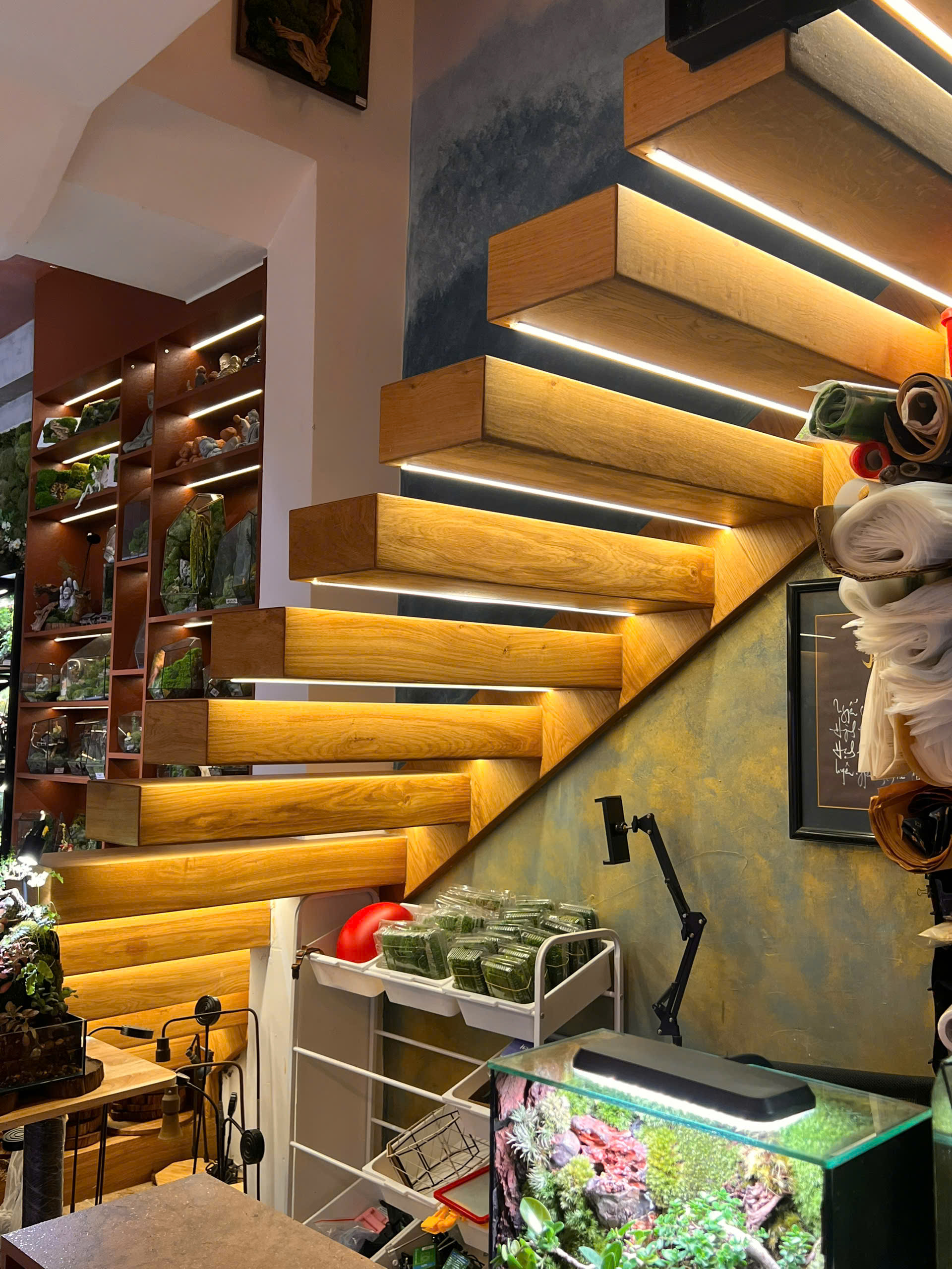 Cầu thang như “trôi nổi”, tạo cảm giác nhẹ, hiện đại.