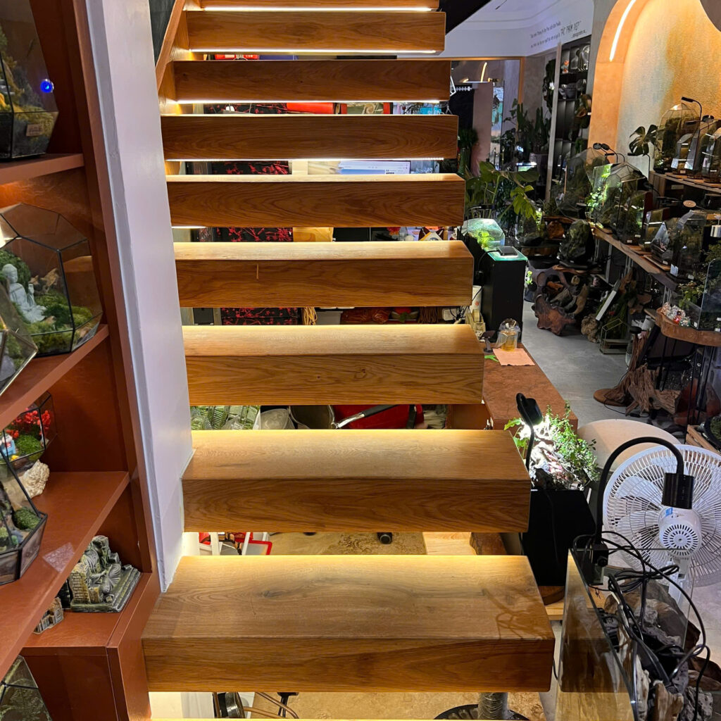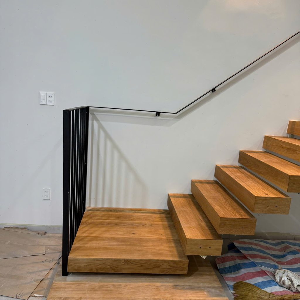 “Cầu thang bay” (Floating Staircase) là kiểu cầu thang có thiết kế nhẹ, thoáng, không khung hoặc không chiếu nghỉ lộ rõ, tạo cảm giác các bậc gỗ như “lơ lửng” giữa không gian.