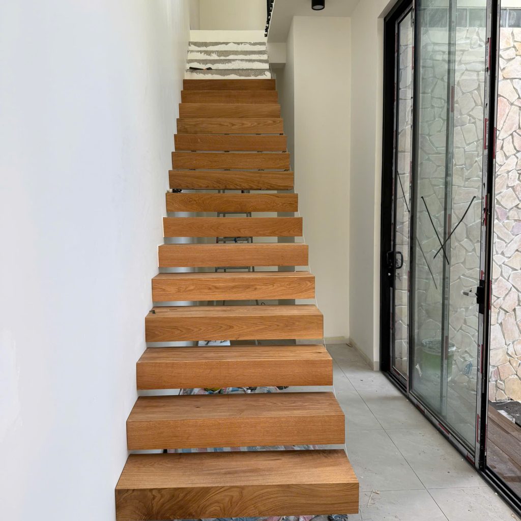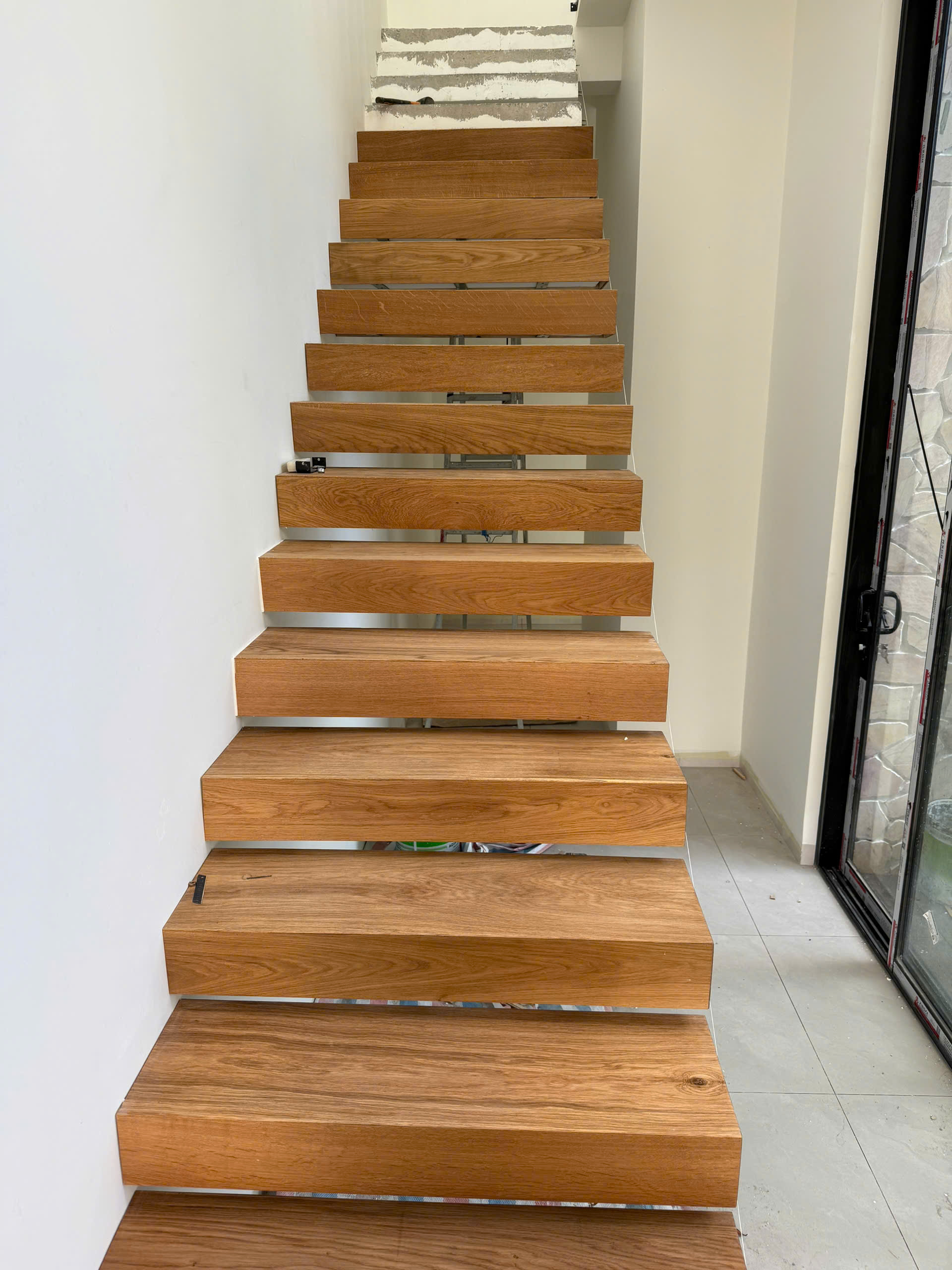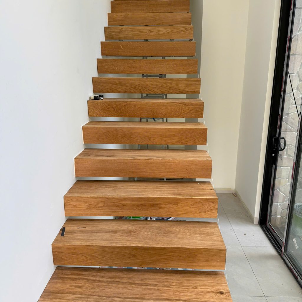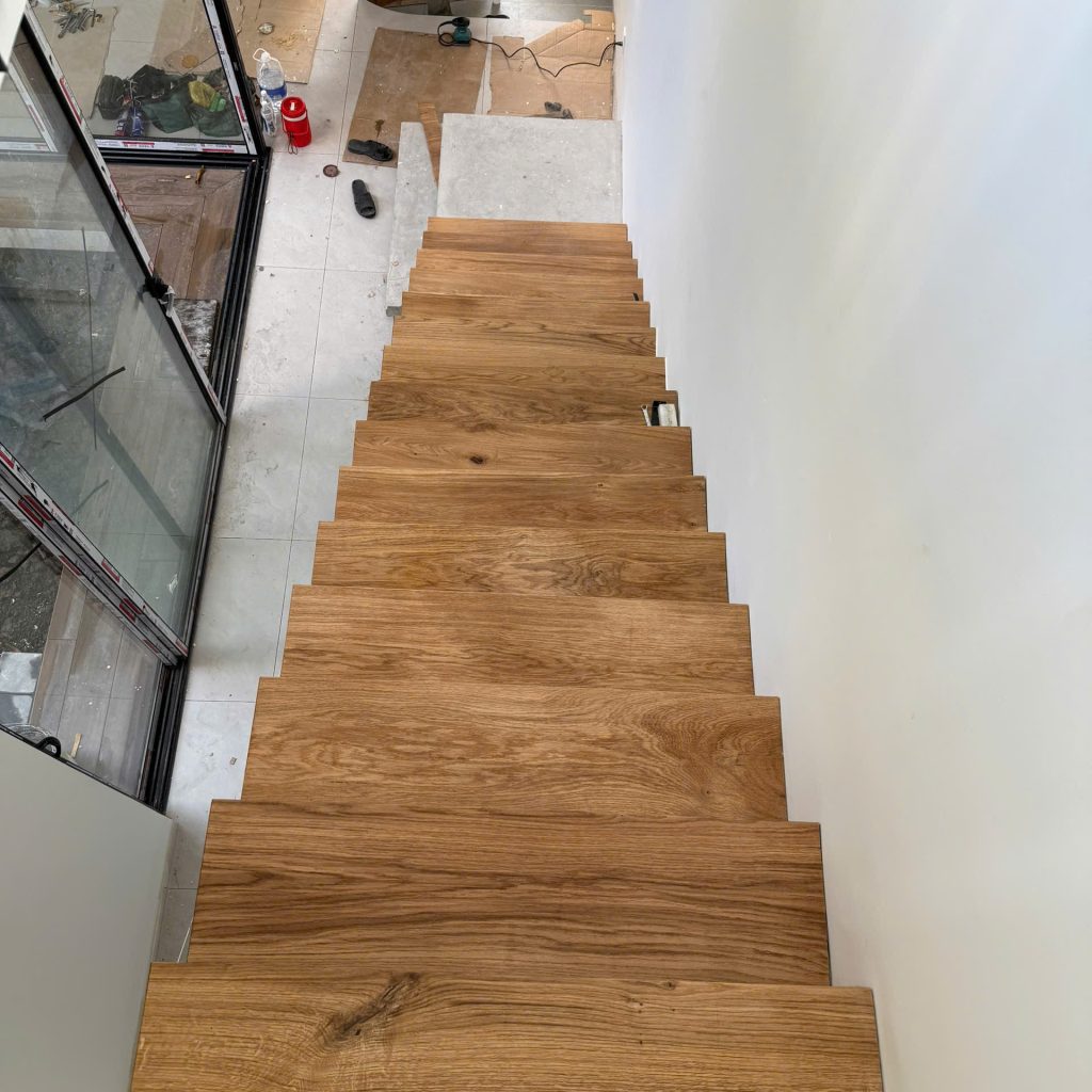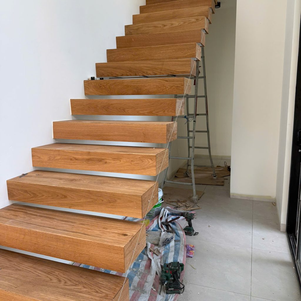 Cầu thang bay gỗ sồi kỹ thuật là sự kết hợp hoàn hảo giữa nghệ thuật thiết kế và công nghệ vật liệu: