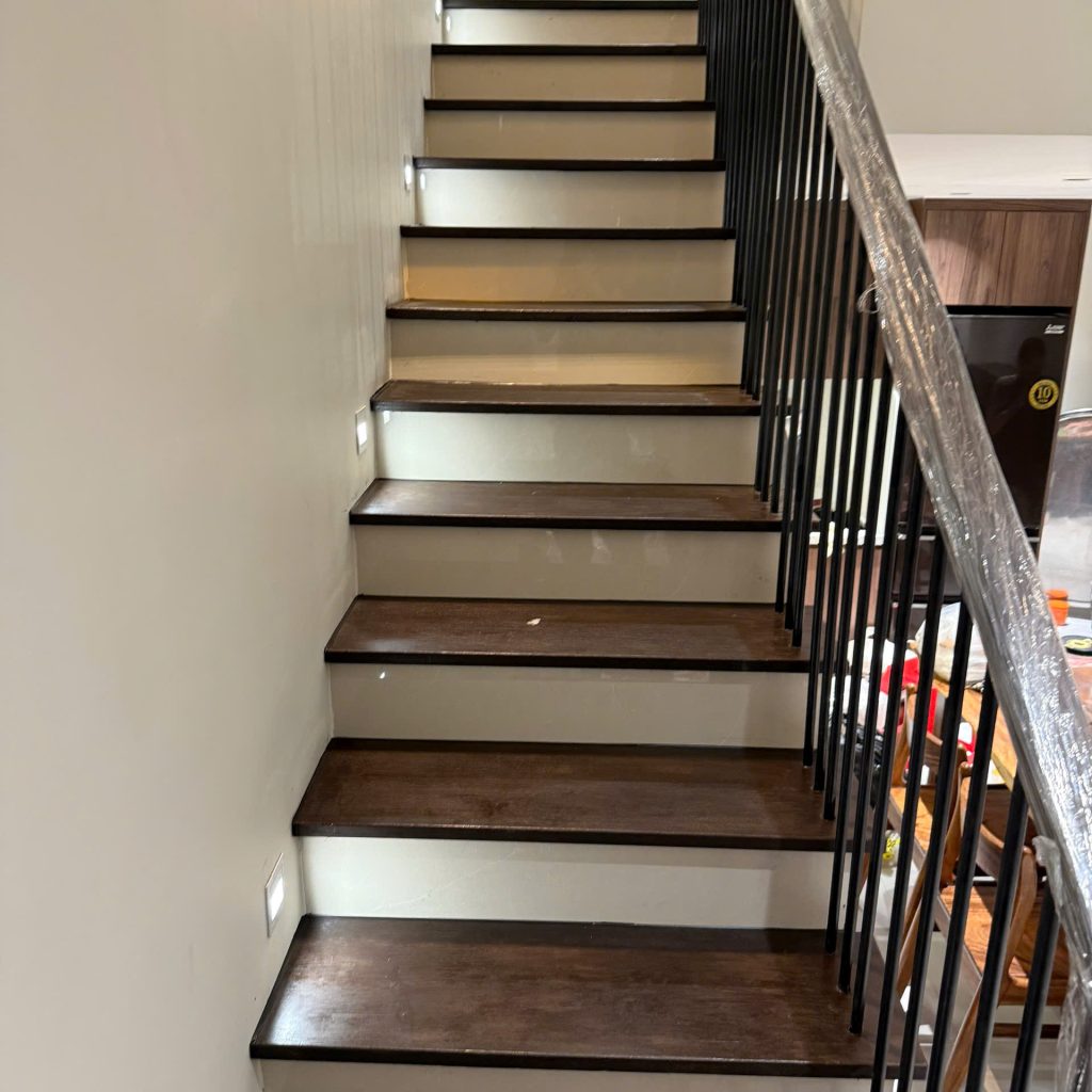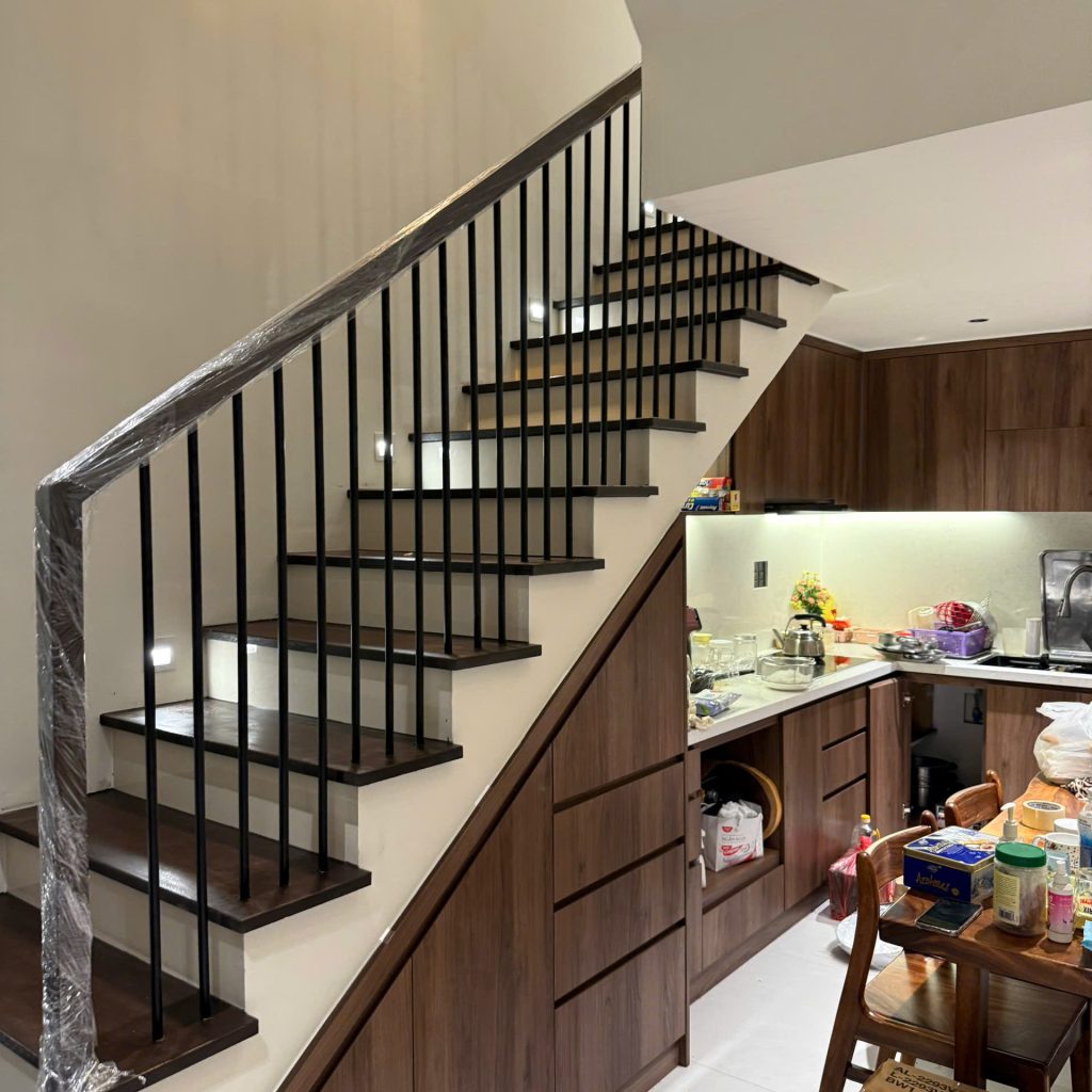 Bậc mặt (tread): Phần dẫm lên, thường làm từ gỗ đặc hoặc gỗ ghép mặt veneer óc chó dày 20–30mm.