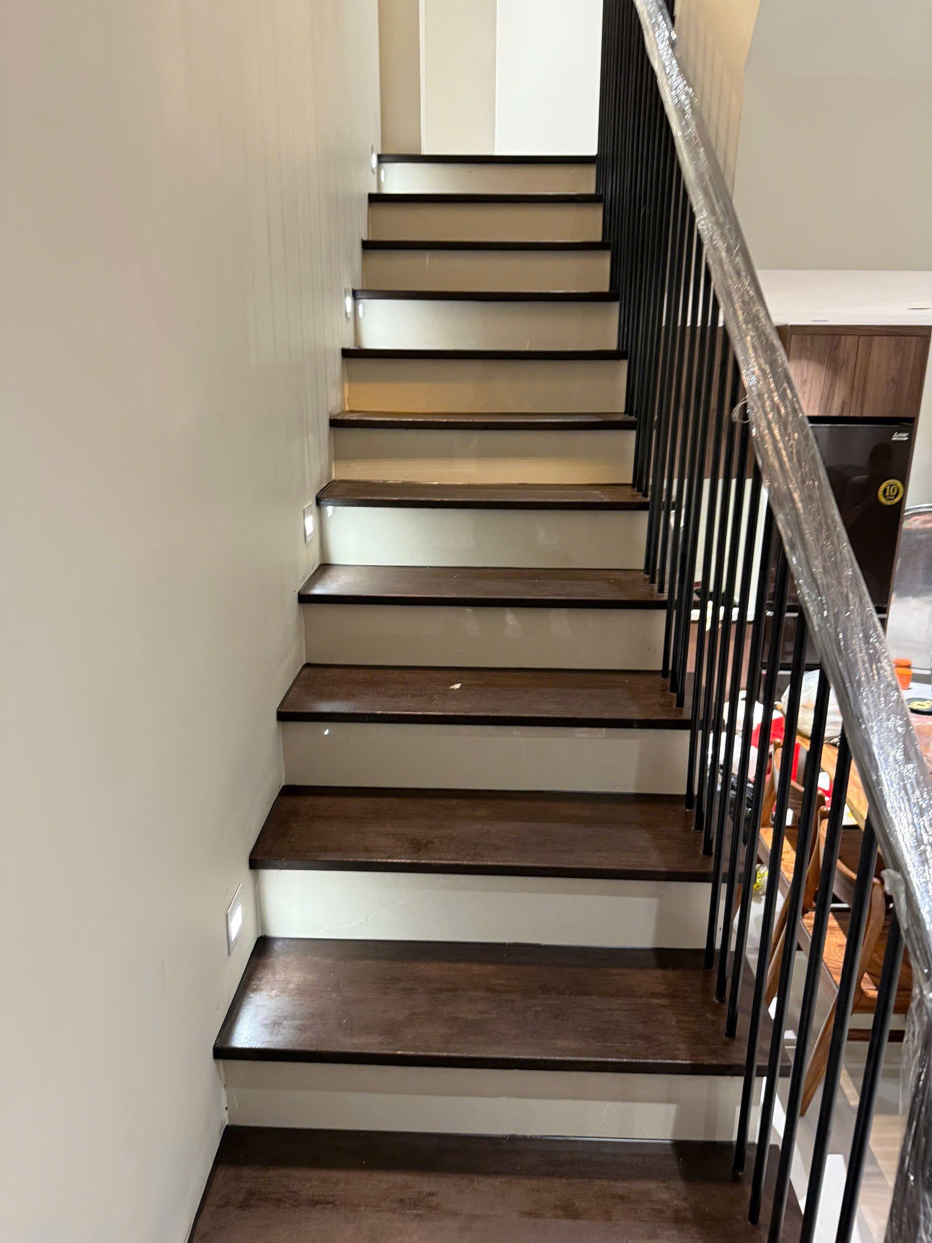 Len tường: Tấm ốp theo mép cầu thang để bảo vệ tường, đồng màu với bậc.